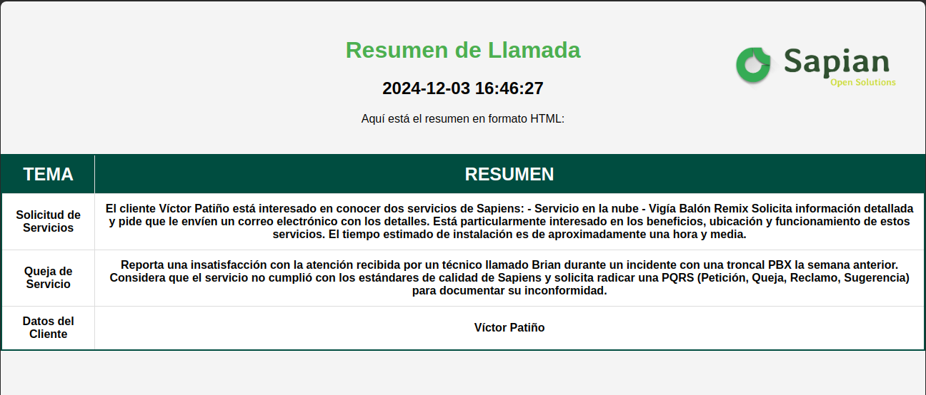 Este proyecto tiene como objetivo procesar grabaciones de llamadas, transcribirlas y generar resúmenes detallados utilizando inteligencia artificial. El sistema está compuesto por dos scripts que trabajan juntos: un servidor HTTP que recibe solicitudes para generar resúmenes y un script que procesa las grabaciones de llamadas y genera los resúmenes.